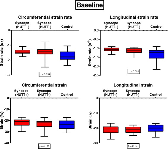 Conclusions: Resting LV longitudinal strain rate is attenuated in children with NS, especially in those with a positive HUTT response. This is further evidence that NS patients feature altered cardiac mechanics rendering them prone to vasovagal perturbations that can ultimately result in collapse.