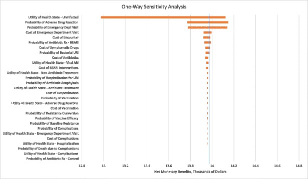 Key results: Each intervention has lower costs but higher QALYs compared to provider education. Total costs for each intervention were $178.21, $173.22, $172.82, and $172.52, and total QALYs were 14.68, 14.73, 14.74, and 14.74 for the control, Suggested Alternatives, Accountable Justification, and Peer Comparison groups, respectively. Results were most sensitive to the quality-of-life of the uninfected state, and the likelihood and costs for antibiotic-associated adverse events.