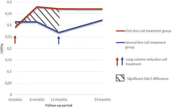 Methods: After one year, the REVOLENS trial's usual care group patients received coil treatment (second-line coil treatment group). Costs and QALYs were assessed in both arms at 2 years and an incremental cost-effectiveness ratio in cost per QALY gained was calculated. The uncertainty of the results was estimated by probabilistic bootstrapping.