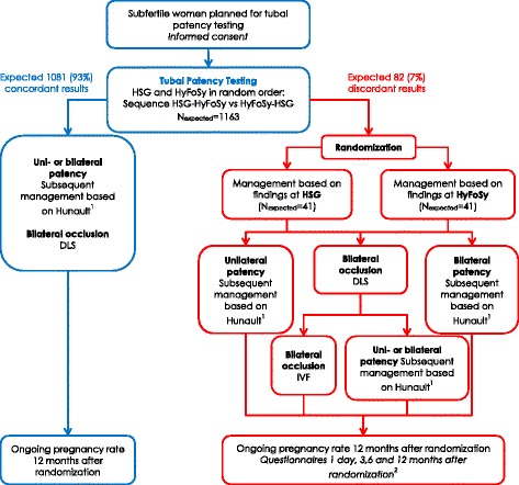 Methods/design: We aim to compare the effectiveness and costs of management guided by HyFoSy or by HSG. Consenting women will undergo tubal testing by both HyFoSy and HSG in a randomized order during fertility work-up. The study group will consist of 1163 subfertile women between 18 and 41 years old who are scheduled for tubal patency testing during their fertility work-up. Women with anovulatory cycles not responding to ovulation induction, endometriosis, severe male subfertility or a known contrast (iodine) allergy will be excluded. We anticipate that 7 % (N = 82) of the participants will have discordant test results for HyFoSy and HSG. These participants will be randomly allocated to either a management strategy based on HyFoSy or a management strategy based on HSG, resulting in either a diagnostic laparoscopy with chromopertubation or a strategy that assumes tubal patency (intrauterine insemination or expectant management). The primary outcome is ongoing pregnancy leading to live birth within 12 months after randomization. Secondary outcomes are patient pain scores, time to pregnancy, clinical pregnancy, miscarriage rate, multiple pregnancy rate, preterm birth rate and number of additional treatments. Costs will be estimated by counting resource use and calculating unit prices.