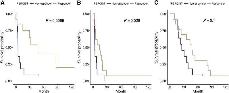 Assessing therapy response of breast cancer bone metastases is challenging. In retrospective studies, serial 18F-FDG PET was predictive of time to skeletal-related events (tSRE) and time to progression (TTP). 18F-NaF PET improves bone metastasis detection compared with bone scanning. We prospectively tested 18F-FDG PET and 18F-NaF PET to predict tSRE, TTP, and overall survival (OS) in patients with bone-dominant metastatic breast cancer (MBC). Methods: Patients with bone-dominant MBC were imaged with 18F-FDG PET and 18F-NaF PET before starting new therapy (scan1) and again at a range of times centered around approximately 4 mo later (scan2). Maximum standardized uptake value (SUVmax) and lean body mass adjusted standardized uptake (SULpeak) were recorded for a single index lesion and up to 5 most dominant lesions for each scan. tSRE, TTP, and OS were assessed exclusive of the PET images. Univariate Cox regression was performed to test the association between clinical endpoints and 18F-FDG PET and 18F-NaF PET measures. mPERCIST (Modified PET Response Criteria in Solid Tumors) were also applied. Survival curves for mPERCIST compared response categories of complete response+partial response+stable disease versus progressive disease for tSRE, TTP, and OS. Results: Twenty-eight patients were evaluated. Higher 18F-FDG SULpeak at scan2 predicted shorter time to tSRE (P = <0.001) and TTP (P = 0.044). Higher 18F-FDG SUVmax at scan2 predicted a shorter time to tSRE (P = <0.001). A multivariable model using 18F-FDG SUVmax of the index lesion at scan1 plus the difference in SUVmax of up to 5 lesions between scans was predictive for tSRE and TTP. Among 24 patients evaluable by 18F-FDG PET mPERCIST, tSRE and TTP were longer in responders (complete response, partial response, or stable disease) than in nonresponders (progressive disease) (P = 0.007, 0.028, respectively), with a trend toward improved survival (P = 0.1). An increase in the uptake between scans of up to 5 lesions by 18F-NaF PET was associated with longer OS (P = 0.027). Conclusion: Changes in 18F-FDG PET parameters during therapy are predictive of tSRE and TTP, but not OS. mPERCIST evaluation in bone lesions may be useful in assessing response to therapy and is worthy of evaluation in multicenter, prospective trials. Serial 18F-NaF PET was associated with OS but was not useful for predicting TTP or tSRE in bone-dominant MBC.