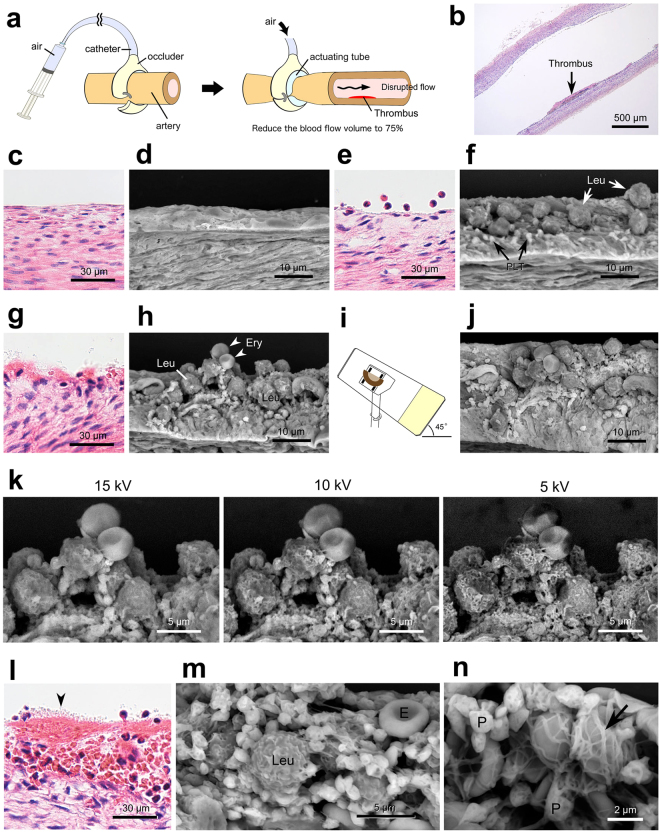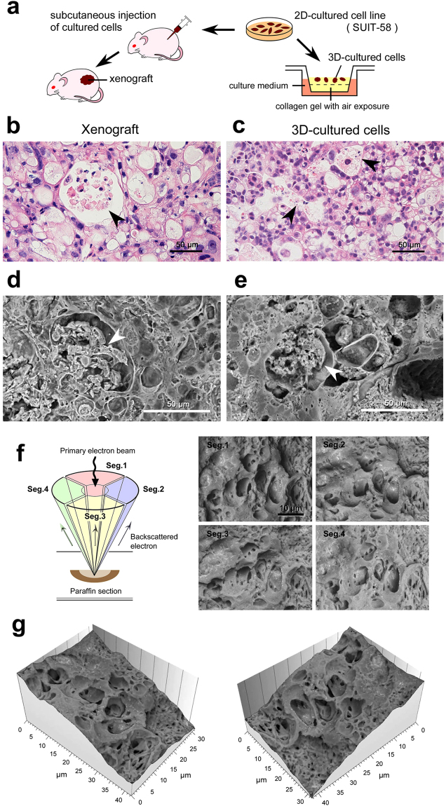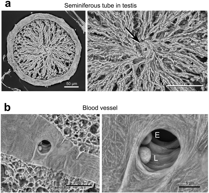 Recent advances in bio-medical research, such as the production of regenerative organs from stem cells, require three-dimensional analysis of cell/tissue architectures. High-resolution imaging by electron microscopy is the best way to elucidate complex cell/tissue architectures, but the conventional method requires a skillful and time-consuming preparation. The present study developed a three-dimensional survey method for assessing cell/tissue architectures in 30-µm-thick paraffin sections by taking advantage of backscattered electron imaging in a low-vacuum scanning electron microscope. As a result, in the kidney, the podocytes and their processes were clearly observed to cover the glomerulus. The 30 µm thickness facilitated an investigation on face-side (instead of sectioned) images of the epithelium and endothelium, which are rarely seen within conventional thin sections. In the testis, differentiated spermatozoa were three-dimensionally assembled in the middle of the seminiferous tubule. Further application to vascular-injury thrombus formation revealed the distinctive networks of fibrin fibres and platelets, capturing the erythrocytes into the thrombus. The four-segmented BSE detector provided topographic bird's-eye images that allowed a three-dimensional understanding of the cell/tissue architectures at the electron-microscopic level. Here, we describe the precise procedures of this imaging method and provide representative electron micrographs of normal rat organs, experimental thrombus formation, and three-dimensionally cultured tumour cells.