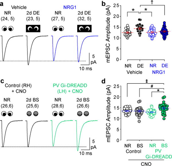 Models of firing rate homeostasis such as synaptic scaling and the sliding synaptic plasticity modification threshold predict that decreasing neuronal activity (for example, by sensory deprivation) will enhance synaptic function. Manipulations of cortical activity during two forms of visual deprivation, dark exposure (DE) and binocular lid suture, revealed that, contrary to expectations, spontaneous firing in conjunction with loss of visual input is necessary to lower the threshold for Hebbian plasticity and increase miniature excitatory postsynaptic current (mEPSC) amplitude. Blocking activation of GluN2B receptors, which are upregulated by DE, also prevented the increase in mEPSC amplitude, suggesting that DE potentiates mEPSCs primarily through a Hebbian mechanism, not through synaptic scaling. Nevertheless, NMDA-receptor-independent changes in mEPSC amplitude consistent with synaptic scaling could be induced by extreme reductions of activity. Therefore, two distinct mechanisms operate within different ranges of neuronal activity to homeostatically regulate synaptic strength.