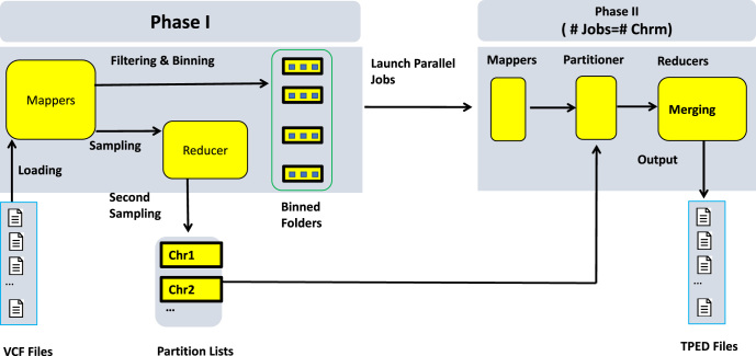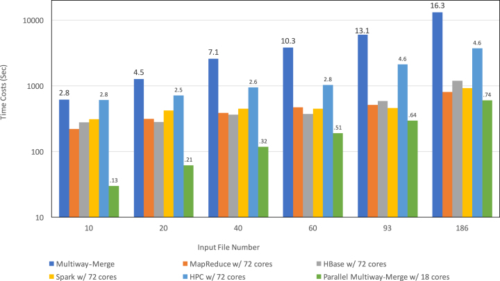 Findings: In this study, we custom-design optimized schemas for three Apache big data platforms, Hadoop (MapReduce), HBase, and Spark, to perform sorted merging of a large number of VCF files. These schemas all adopt the divide-and-conquer strategy to split the merging job into sequential phases/stages consisting of subtasks that are conquered in an ordered, parallel, and bottleneck-free way. In two illustrating examples, we test the performance of our schemas on merging multiple VCF files into either a single TPED or a single VCF file, which are benchmarked with the traditional single/parallel multiway-merge methods, message passing interface (MPI)-based high-performance computing (HPC) implementation, and the popular VCFTools.