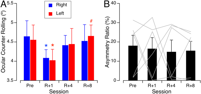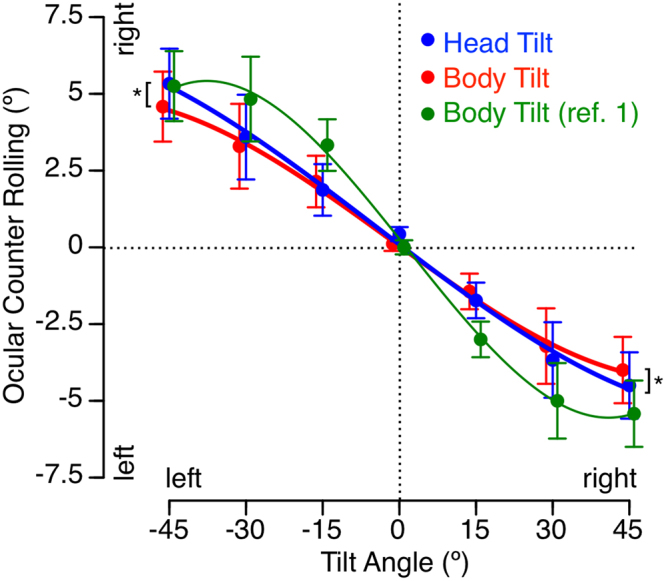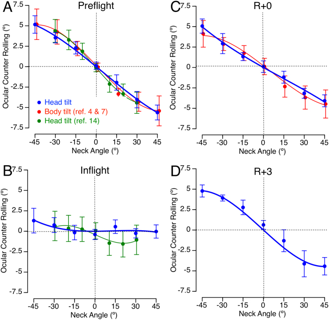 Ocular counter-rolling (OCR) is a reflex generated by the activation of the gravity sensors in the inner ear that stabilizes gaze and posture during head tilt. We compared the OCR measures that were obtained in 6 astronauts before, during, and after a spaceflight lasting 4-6 days with the OCR measures obtained from 6 astronauts before and after a spaceflight lasting 4-9 months. OCR in the short-duration fliers was measured using the afterimage method during head tilt at 15°, 30°, and 45°. OCR in the long-duration fliers was measured using video-oculography during whole body tilt at 25°. A control group of 7 subjects was used to compare OCR measures during head tilt and whole body tilt. No OCR occurred during head tilt in microgravity, and the response returned to normal within 2 hours of return from short-duration spaceflight. However, the amplitude of OCR was reduced for several days after return from long-duration spaceflight. This decrease in amplitude was not accompanied by changes in the asymmetry of OCR between right and left head tilt. These results indicate that the adaptation of otolith-driven reflexes to microgravity is a long-duration process.
