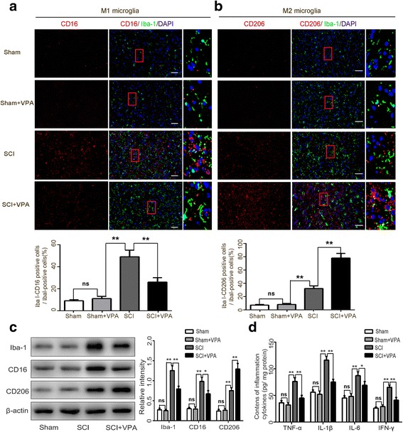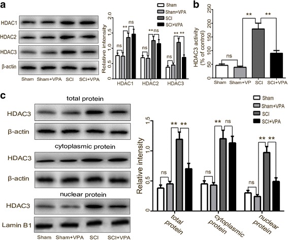 Results: The results showed that the VPA treatment promoted the phenotypic shift of microglia from M1 to M2 phenotype and inhibited microglial activation, thus reducing the SCI-induced inflammatory factors. The VPA treatment upregulation of the acetylation of STAT1/NF-κB pathway was likely caused by the HDAC3 translocation to the nucleus and activity. These results indicated that the treatment with the VPA suppressed the expression and the activity of HDAC3 and enhanced STAT1, as well as NF-κB p65 acetylation following a SCI. The acetylation status of NF-kB p65 and the complex with NF-κB p65 and STAT1 inhibited the NF-kB p65 transcriptional activity and attenuated the microglia-mediated central inflammatory response following SCI.