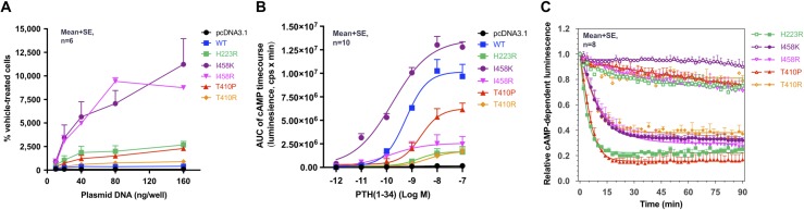 Conclusions: Except for T410R, the other PTHR1 mutations were associated with indistinguishable mineral ion abnormalities and cause similarly severe growth impairment. Hypercalciuria persisted into adulthood. An inverse agonist ligand effectively reduced in vitro PTH-independent cAMP formation at all five PTHR1 mutants, suggesting a potential path toward therapy.