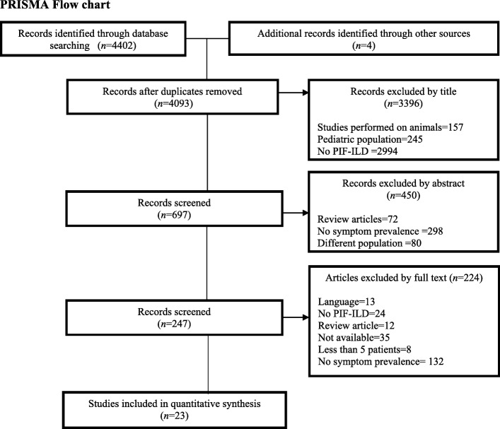 Results: A total of 4086 titles were screened for eligibility criteria; 23 studies were included for analysis. The highest prevalence was that for breathlessness (54-98%) and cough (59-100%) followed by heartburn (25-65%) and depression (10-49%). The heterogeneity of studies limited their comparability, but many of the symptoms present in patients with other end-stage disease were also seen in PIF-ILD.