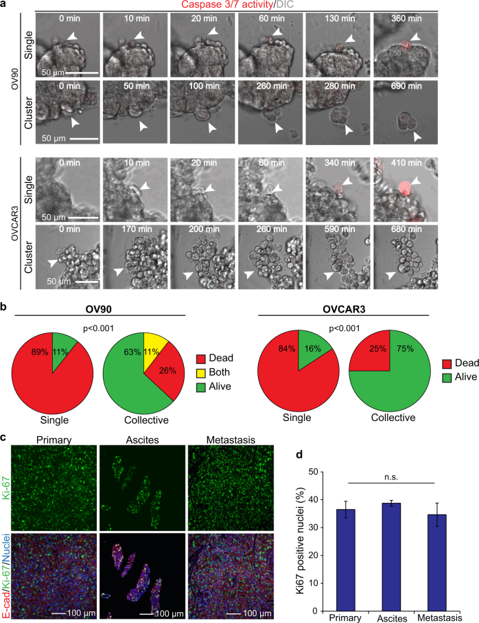 Ovarian cancer is the most lethal gynecological cancer, where survival rates have had modest improvement over the last 30 years. Metastasis of cancer cells is a major clinical problem, and patient mortality occurs when ovarian cancer cells spread beyond the confinement of ovaries. Disseminated ovarian cancer cells typically spread within the abdomen, where ascites accumulation aids in their transit. Metastatic ascites contain multicellular spheroids, which promote chemo-resistance and recurrence. However, little is known about the origin and mechanisms through which spheroids arise. Using live-imaging of 3D culture models and animal models, we report that epithelial ovarian cancer (EOC) cells, the most common type of ovarian cancer, can spontaneously detach as either single cells or clusters. We report that clusters are more resistant to anoikis and have a potent survival advantage over single cells. Using in vivo lineage tracing, we found that multicellular spheroids arise preferentially from collective detachment, rather than aggregation in the abdomen. Finally, we report that multicellular spheroids from collective detachment are capable of seeding intra-abdominal metastases that retain intra-tumoral heterogeneity from the primary tumor.