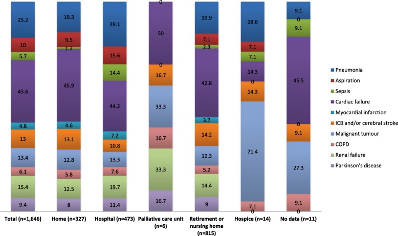 Results: A total of 10,364 death certificates were analyzed. Dementia was recorded in 1646 cases (15.9%; mean age 86.3 ± 6.9 years; 67.3% women). On average, 1.5 ± 1.0 selected comorbidities were present. Places of death were distributed as follows: home (19.9%), hospital (28.7%), palliative care unit (0.4%), nursing home (49.5%), hospice (0.9%), no details (0.7%). The death certificates documented cardiac failure in 43.6% of cases, pneumonia in 25.2%, and malignant tumour in 13.4%. An increased likelihood of dying in hospital compared to home or nursing home, respectively, was found for the following comorbidities (OR [95%-CI]): pneumonia (2.96 [2.01-4.35], p = 0.001); (2.38 [1.75-3.25], p = 0.001); renal failure (1.93 [1.26-2.97], p = 0.003); (1.65 [1.18-2.32], p = 0.003); and sepsis (13.73 [4.88-38.63], p = 0.001); (7.34 [4.21-12.78], p = 0.001).