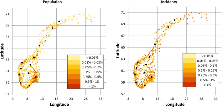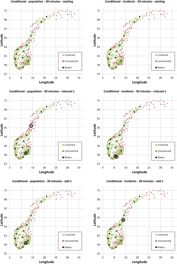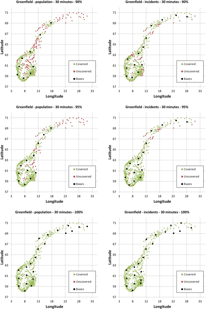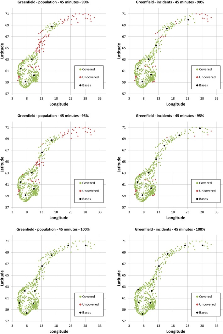 Results: The existing bases covered 96.90% of the population and 91.86% of the incidents for time threshold 45 min. Correlation between municipality population and incident frequencies was -0.0027, and optimal base locations varied markedly between the two data types, particularly when lowering the target time. The optimal solution using population density data put focus on the greater Oslo area, where one third of Norwegians live, while using incident data put focus on low population high incident areas, such as northern Norway and winter sport resorts.