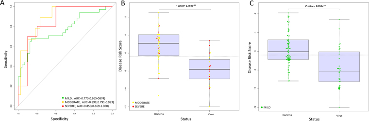 Recently, a biomarker signature consisting of 2-transcript host RNAs was proposed for discriminating bacterial from viral infections in febrile children. We evaluated the performance of this signature in a different disease scenario, namely a cohort of Mexican children (n = 174) suffering from acute diarrhea of different infectious etiologies. We first examined the admixed background of the patients, indicating that most of them have a predominantly Native American genetic ancestry with a variable amount of European background (ranging from 0% to 57%). The results confirm that the RNA test can discriminate between viral and bacterial causes of infection (t-test; P-value = 6.94×10-11; AUC = 80%; sensitivity: 68% [95% CI: 55%-79%]; specificity: 84% [95% CI: 78%-90%]), but the strength of the signal differs substantially depending on the causal pathogen, with the stronger signal being that of Shigella (P-value = 3.14 × 10-12; AUC = 89; sensitivity: 70% [95% CI: 57%-83%]; specificity: 100% [95% CI: 100%-100%]). The accuracy of this test improves significantly when excluding mild cases (P-value = 2.13 × 10-6; AUC = 85%; sensitivity: 79% [95% CI: 58%-95%]; specificity: 78% [95% CI: 65%-88%]). The results broaden the scope of previous studies by incorporating different pathogens, variable levels of disease severity, and different ancestral background of patients, and add confirmatory support to the clinical utility of these 2-transcript biomarkers.
