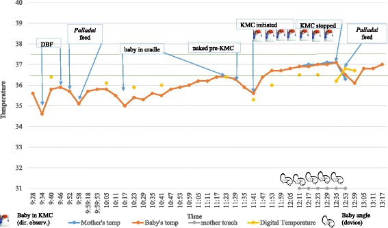 Background: Remote biomonitoring of vital parameters in hospitals and homes has the potential to improve coverage and quality of maternal and neonatal health. Wearable sensors coupled with modern information and communication technology now offer an opportunity to monitor temperatures and kangaroo mother care (KMC) adherence in a continuous and real-time manner remotely for several days' duration in hospital and home settings. Using an innovative remote biomonitoring device to measure both temperature and baby position, we undertook a techno-feasibility study in preparation for a clinical trial.