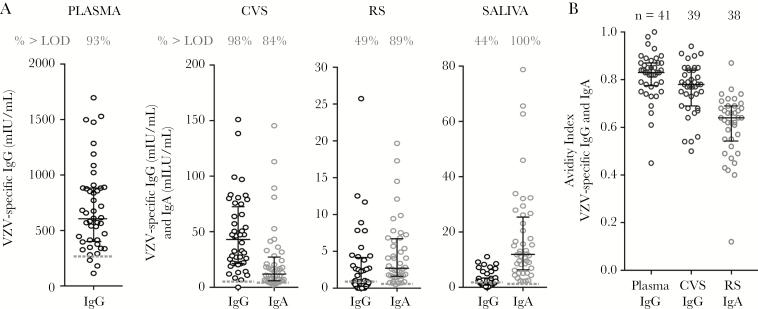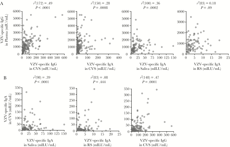 Results: Besides boosting anti-VZV antibody responses systemically, vaccination also boosted anti-VZV immunity in the cervicovaginal mucosa with a 2.9-fold rise in immunoglobulin G (P < .0001) and 1.6-fold rise in immunoglobulin A (IgA) (P = .004) from the time before immunization and 4 weeks postvaccination. Baseline analysis demonstrated high avidity antibodies at the gastrointestinal and genital mucosa of VZV-seropositive women. Measurement of VZV-specific IgA in saliva is a sensitive tool for detecting prior VZV infection.