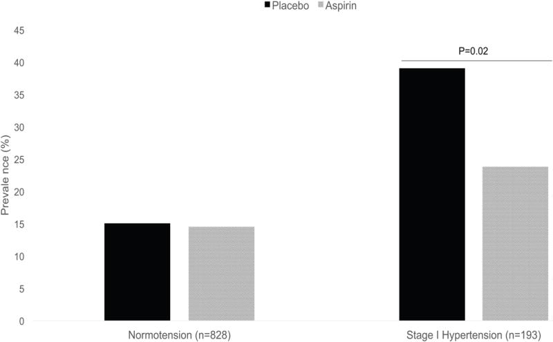 Recently, the American College of Cardiology/American Heart Association Task Force on Clinical Practice Guidelines revised the recommendations for diagnosis of chronic hypertension. The new classification system includes a diagnosis of stage 1 hypertension in adults with blood pressures 130 to 139/80 to 89 mm Hg. We sought to compare outcomes among women at high risk for preeclampsia with stage 1 hypertension and assessed whether women with stage 1 hypertension had benefit from aspirin treatment compared with high-risk normotensive women. We performed a secondary analysis of the high-risk aspirin trial and included women with prior preeclampsia or diabetes mellitus. Among these women, 827 (81%) were classified as normotensive, whereas 193 (19%) were classified as stage 1 hypertensive. Among women receiving placebo, preeclampsia occurred significantly more often in women with stage 1 hypertension compared with normotensive high-risk women after adjustment for maternal age and body mass index (39.1% versus 15.1%; risk ratio, 2.49; 95% confidence interval, 1.74-3.55). Further, women with stage 1 hypertension had a significant risk reduction related to aspirin prophylaxis (risk ratio, 0.61; 95% confidence interval, 0.39-0.94) that was not seen in normotensive high-risk women (risk ratio, 0.97; 95% confidence interval, 0.70-1.34). Application of the American College of Cardiology/American Heart Association guidelines in a high-risk population demonstrates that in the setting of other risk factors, the presence of stage 1 hypertension is associated with a significantly increased risk of preeclampsia when compared with high-risk normotensive women. These findings emphasize the importance of recognition of stage 1 hypertension as an additive risk factor in women at high risk for preeclampsia and the benefit of aspirin.