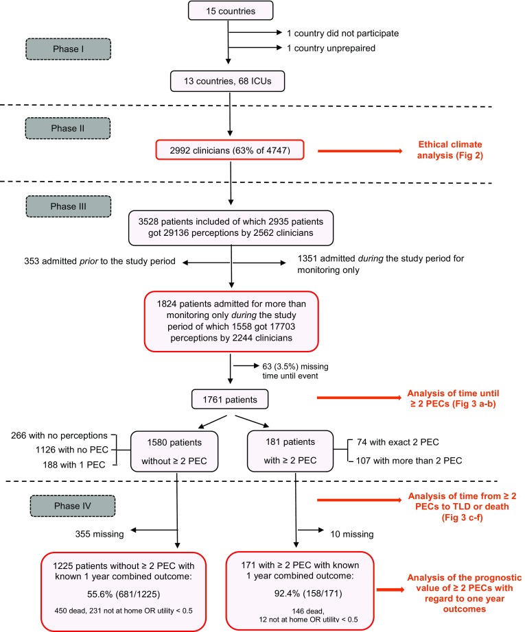 Results: Of the 4747 eligible clinicians, 2992 (63%) evaluated the ethical climate in their ICU. Of the 321 and 623 patients not admitted for monitoring only in ICUs with a good (n = 12, 18%) and poor (n = 24, 35%) climate, 36 (11%) and 74 (12%), respectively were identified with PECs by at least two clinicians. Of the 35 and 71 identified patients with an available combined endpoint, 100% (95% CI 90.0-1.00) and 85.9% (75.4-92.0) (P = 0.02) attained that endpoint. The risk of death (HR 1.88, 95% CI 1.20-2.92) or receiving a written TLD (HR 2.32, CI 1.11-4.85) in patients with PECs by at least two clinicians was higher in ICUs with a good climate than in those with a poor one. The differences between ICUs with an average climate, with (n = 12, 18%) or without (n = 20, 29%) nursing involvement at the end of life, and ICUs with a poor climate were less obvious but still in favour of the former.