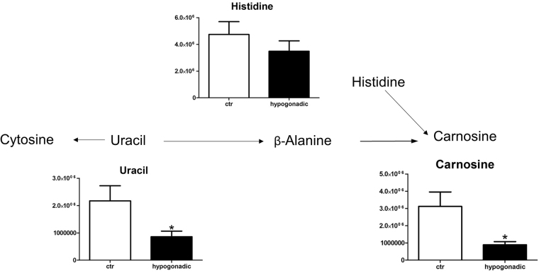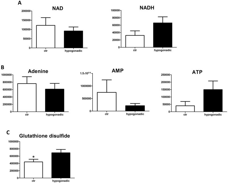 Male hypogonadism is a disorder characterised by low levels of the hormone testosterone. At beginning subjects with low levels of testosterone do not show insulin resistance (insulin-sensitive patients), which develops over time (insulin-resistance patients). To analyse the metabolic alterations mainly related to decreased testosterone, we performed metabolomics investigations on the plasma of males with hypogonadism who showed normal insulin levels. Plasma from patients with low testosterone (<8 nmol/l) and homeostatic model assessment for insulin-resistance-index (HOMAi) < 2.5, as well as matched controls, was analysed by UHPLC and mass spectrometry. Then metabolites were then subjected to multivariate statistical analysis and grouped by metabolic pathways. Glycolysis was not altered, as expected for the presence of insulin activity, but imbalances in several other pathways were found, such as the pentose phosphate pathway (PPP), glycerol shuttle, malate shuttle, Krebs cycle (TCA) and lipid metabolism. The PPP was significantly upregulated. Moreover, while the first steps of the Krebs cycle were downregulated, 2-oxoglutarate was replenished via glutaminolysis. Since glutaminolysis leads to an activation of the malate aspartate cycle, greater amounts of NADH and ATP with respect to the control were recorded. The activation of the glycerol shuttle was also recorded, with consequent lower triglyceride production and downregulation of beta-oxidation. This explained the moderately increased dyslipidaemia, as well as the mild increase in body mass index (BMI) observed in insulin-sensitive hypogonadism. Finally, a significant decrease in carnosine was recorded, explaining the muscle weakness commonly observed.