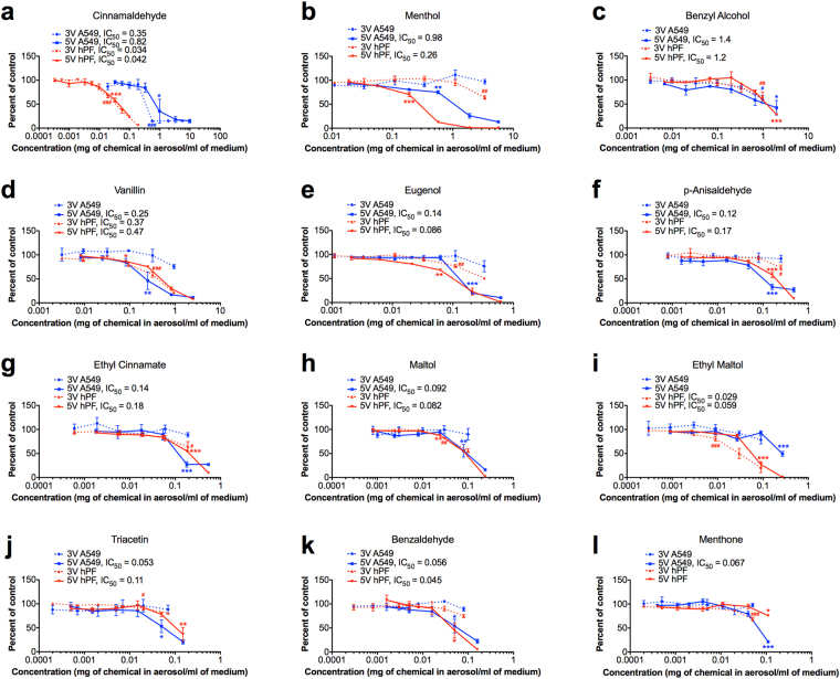 Thousands of electronic cigarette refill fluids are commercially available. The concentrations of nicotine and the solvents, but not the flavor chemicals, are often disclosed on product labels. The purpose of this study was to identify and quantify flavor chemicals in 39 commercial refill fluids that were previously evaluated for toxicity. Twelve flavor chemicals were identified with concentrations ≥1 mg/ml: cinnamaldehyde, menthol, benzyl alcohol, vanillin, eugenol, p-anisaldehyde, ethyl cinnamate, maltol, ethyl maltol, triacetin, benzaldehyde, and menthone. Transfer of these flavor chemicals into aerosols made at 3V and 5V was efficient (mean transfer = 98%). We produced lab-made refill fluids containing authentic standards of each flavor chemical and analyzed the toxicity of their aerosols produced at 3V and 5V using a tank Box Mod device. Over 50% of the refill fluids in our sample contained high concentrations of flavor chemicals that transferred efficiently to aerosols at concentrations that produce cytotoxicity. When tested with two types of human lung cells, the aerosols made at 5V were generally more toxic than those made at 3V. These data will be valuable for consumers, physicians, public health officials, and regulatory agencies when discussing potential health concerns relating to flavor chemicals in electronic cigarette products.
