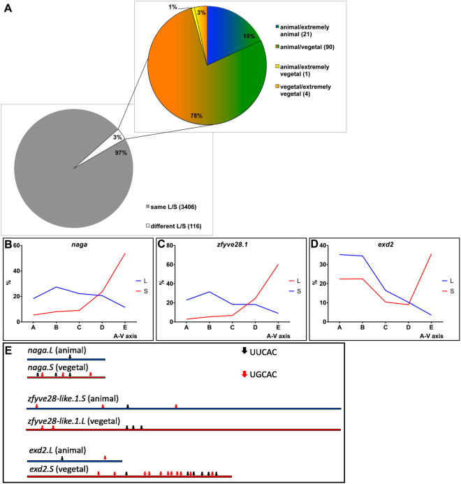 Asymmetric cell division is a ubiquitous feature during the development of higher organisms. Asymmetry is achieved by differential localization or activities of biological molecules such as proteins, and coding and non-coding RNAs. Here, we present subcellular transcriptomic and proteomic analyses along the animal-vegetal axis of Xenopus laevis eggs. More than 98% of the maternal mRNAs could be categorized into four localization profile groups: animal, vegetal, extremely vegetal, and a newly described group of mRNAs that we call extremely animal, which are mRNAs enriched in the animal cortex region. 3'UTRs of localized mRNAs were analyzed for localization motifs. Several putative motifs were discovered for vegetal and extremely vegetal mRNAs, while no distinct conserved motifs for the extremely animal mRNAs were identified, suggesting different localization mechanisms. Asymmetric profiles were also found for proteins, with correlation to those of corresponding mRNAs. Based on unexpected observation of the profiles of the homoeologous genes exd2 we propose a possible mechanism of genetic evolution.