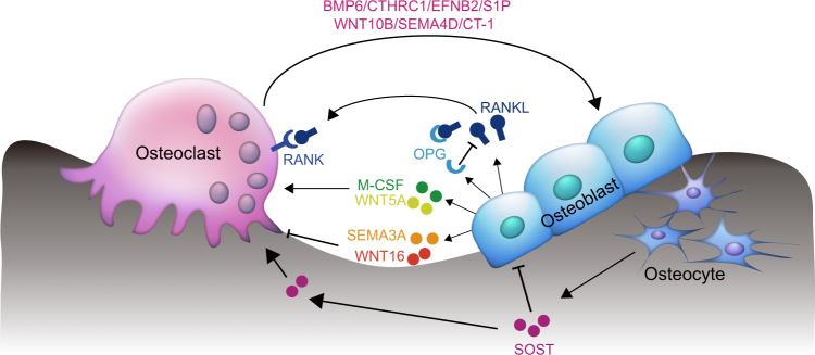 The skeleton is a dynamic organ that is constantly remodeled. Proteins secreted from bone cells, namely osteoblasts, osteocytes, and osteoclasts exert regulation on osteoblastogenesis, osteclastogenesis, and angiogenesis in a paracrine manner. Osteoblasts secrete a range of different molecules including RANKL/OPG, M-CSF, SEMA3A, WNT5A, and WNT16 that regulate osteoclastogenesis. Osteoblasts also produce VEGFA that stimulates osteoblastogenesis and angiogenesis. Osteocytes produce sclerostin (SOST) that inhibits osteoblast differentiation and promotes osteoclast differentiation. Osteoclasts secrete factors including BMP6, CTHRC1, EFNB2, S1P, WNT10B, SEMA4D, and CT-1 that act on osteoblasts and osteocytes, and thereby influenceaA osteogenesis. Osteoclast precursors produce the angiogenic factor PDGF-BB to promote the formation of Type H vessels, which then stimulate osteoblastogenesis. Besides, the evidences over the past decades show that at least three hormones or "osteokines" from bone cells have endocrine functions. FGF23 is produced by osteoblasts and osteocytes and can regulate phosphate metabolism. Osteocalcin (OCN) secreted by osteoblasts regulates systemic glucose and energy metabolism, reproduction, and cognition. Lipocalin-2 (LCN2) is secreted by osteoblasts and can influence energy metabolism by suppressing appetite in the brain. We review the recent progresses in the paracrine and endocrine functions of the secretory proteins of osteoblasts, osteocytes, and osteoclasts, revealing connections of the skeleton with other tissues and providing added insights into the pathogenesis of degenerative diseases affecting multiple organs and the drug discovery process.
