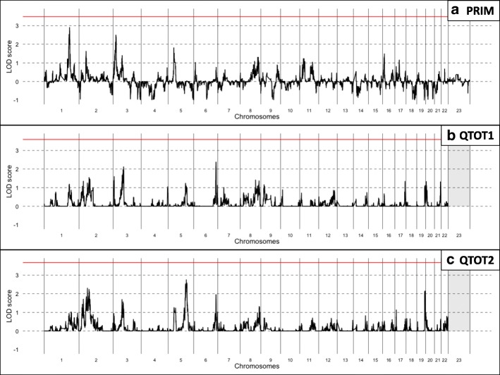 Methods: To identify such genetic factors, we conducted a genome-wide linkage scan in 464 extended families with 2616 individuals from Iowa, Pennsylvania and West Virginia for three dental caries phenotypes: (1) PRIM: dichotomized as zero versus one or more affected primary teeth, (2) QTOT1: age-adjusted quantitative caries measure for both primary and permanent dentitions including pre-cavitated lesions, and (3) QTOT2: age-adjusted quantitative caries excluding pre-cavitated lesions. Genotyping was conducted for approximately 600,000 SNPs on an Illumina platform, pruned to 127,511 uncorrelated SNPs for the analyses reported here.
