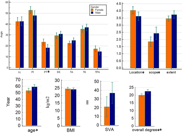 Results: The mean ages of the male and female patient groups were 59.00 and 53.28 years old, respectively (P < 0.05). The PT, location, scope, and overall degree of degradation were significantly different between the sexes (P < 0.05). Linear correlation analysis results showed that the overall degree and extent of degradation (r = 0.788, P < 0.01), LL and SS (r = 0.737, P < 0.01), PI and PT (r = 0.607, P < 0.01), and TPA and PT (r = 0.899, P < 0.01) were strongly correlated. The location values were 4.08 ± 0.72 in patients with PI≤50° and 3.62 ± 0.94 in patients with PI> 50° (P = 0.018). Different SVASVA groups differed in their overall degree of degeneration (P = 0.002).