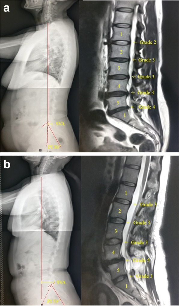 Conclusions: The location of lumbar intervertebral disc degeneration is affected by spinal-pelvic sagittal morphology. Populations with small PI values tend to exhibit degeneration at the L4/5 and L5/S1 discs, and populations with large PI values tend to exhibit degeneration at the L3/4 and L4/5 discs. The SVA value and the overall degree of lumbar disc degeneration are positively correlated.