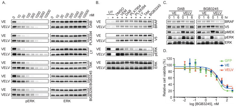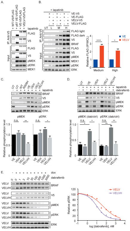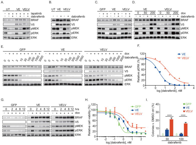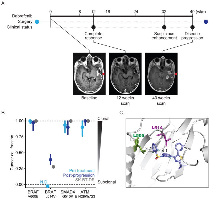 BRAFV600E hyperactivates ERK and signals as a RAF inhibitor-sensitive monomer. Although RAF inhibitors can produce impressive clinical responses in patients with mutant BRAF tumors, the mechanisms of resistance to these drugs are incompletely characterized. Here, we report a complete response followed by clinical progression in a patient with a BRAFV600E-mutant brain tumor treated with dabrafenib. Whole-exome sequencing revealed a secondary BRAFL514V mutation at progression that was not present in the pretreatment tumor. Expressing BRAFV600E/L514V induces ERK signaling, promotes RAF dimer formation, and is sufficient to confer resistance to dabrafenib. Newer RAF dimer inhibitors and an ERK inhibitor are effective against BRAFL514V-mediated resistance. Collectively, our results validate a novel biochemical mechanism of RAF inhibitor resistance mediated by a secondary mutation, emphasizing that, like driver mutations in cancer, the spectrum of mutations that drive resistance to targeted therapy are heterogeneous and perhaps emerge with a lineage-specific prevalence.Significance: In contrast to receptor tyrosine kinases, in which secondary mutations are often responsible for acquired resistance, second-site mutations in BRAF have not been validated in clinically acquired resistance to RAF inhibitors. We demonstrate a secondary mutation in BRAF (V600E/L514V) following progression on dabrafenib and confirm functionally that this mutation is responsible for resistance. Cancer Discov; 8(9); 1130-41. ©2018 AACR.See related commentary by Romano and Kwong, p. 1064This article is highlighted in the In This Issue feature, p. 1047.