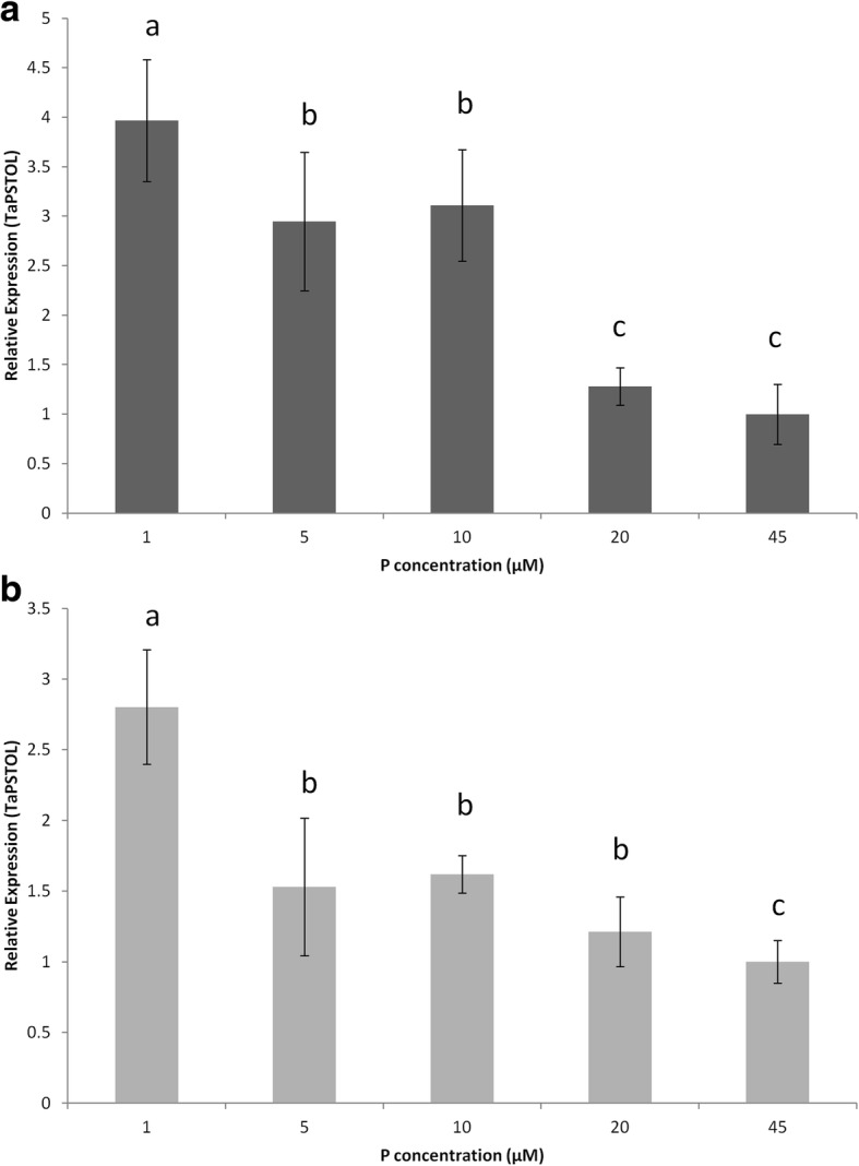 Results: TaPSTOL is a single copy gene located on the short arm of chromosome 5A, encoding a putative kinase protein, and shares a high level of sequence similarity to OsPSTOL. We re-sequenced TaPSTOL from 24 different wheat accessions and (3) three T. durum varieties. No sequence differences were detected in 26 of the accessions, whereas two indels were identified in the promoter region of one of the durum wheats. We characterised the expression of TaPSTOL under different P concentrations and demonstrated that the promoter was induced in root tips and hairs under P limiting conditions. Overexpression and RNAi silencing of TaPSTOL in transgenic wheat lines showed that there was a significant effect upon root biomass, flowering time independent of P treatment, tiller number and seed yield, correlating with the expression of TaPSTOL. However this did not increase PUE as elevated P concentration in the grain did not correspond to increased yields.