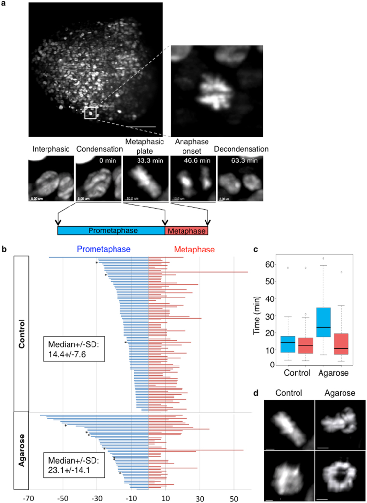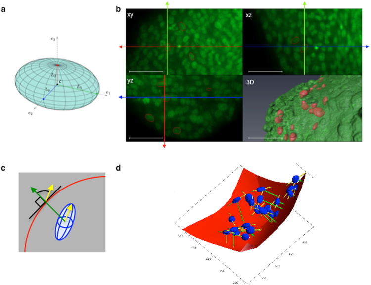 Multicellular tumour spheroids are used as a culture model to reproduce the 3D architecture, proliferation gradient and cell interactions of a tumour micro-domain. However, their 3D characterization at the cell scale remains challenging due to size and cell density issues. In this study, we developed a methodology based on 3D light sheet fluorescence microscopy (LSFM) image analysis and convex hull calculation that allows characterizing the 3D shape and orientation of cell nuclei relative to the spheroid surface. By using this technique and optically cleared spheroids, we found that in freely growing spheroids, nuclei display an elongated shape and are preferentially oriented parallel to the spheroid surface. This geometry is lost when spheroids are grown in conditions of physical confinement. Live 3D LSFM analysis of cell division revealed that confined growth also altered the preferential cell division axis orientation parallel to the spheroid surface and induced prometaphase delay. These results provide key information and parameters that help understanding the impact of physical confinement on cell proliferation within tumour micro-domains.