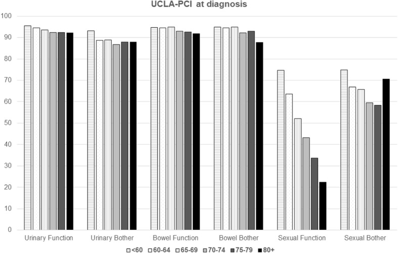 Results: At diagnosis, lower scores on the physical component of the SF-12 were associated to older ages, obesity and the presence of 3+ moderate/severe comorbidities. Lower scores on the mental component were associated to younger ages, the presence of 3+ moderate/severe comorbidities and a T-score higher than one. Urinary and bowel functions according to UCLA-PCI were generally good. Almost 5% of the sample reported using at least one safety pad daily to control urinary loss; less than 3% reported moderate/severe problems attributable to bowel functions, and sexual function was a moderate/severe problem for 26.7%. Diabetes, 3+ moderate/severe comorbidities, T2 or T3-T4 categories and a Gleason score of eight or more were significantly associated with lower sexual function scores at diagnosis.