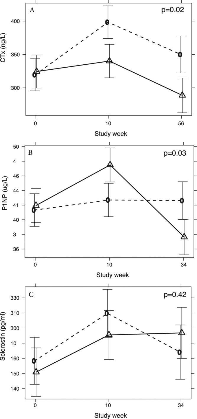 To assess the effect of testosterone treatment on bone remodelling and density in dieting obese men, 100 obese men aged 53 years (interquartile range 47-60) with a total testosterone level <12 nmol/L receiving 10 weeks of a very low energy diet (VLED) followed by 46 weeks of weight maintenance were randomly assigned at baseline to 56 weeks of intramuscular testosterone undecanoate (n = 49, cases) or matching placebo (n = 51, controls). Pre-specified outcomes were between-group differences (mean adjusted difference, MAD) in serum c-telopeptide (CTx), N-terminal propeptide of type 1 procollagen (P1NP) and bone mineral density (BMD). At trial end, CTx was significantly reduced in men receiving testosterone compared to placebo, MAD -66 ng/L (95% CI -113, -18), p = 0.018, and this was apparent already after the 10 week VLED phase, MAD -63 ng/L (95% CI -108, -18), p = 0.018. P1NP was marginally increased after VLED, MAD +4.2 ug/L (95% CI -0.01, +8.4), p = 0.05 but lower at study end, MAD -5.6 ug/L (95% CI -10.1, -1.1), p = 0.03. No significant changes in sclerostin, lumbar spine BMD or femoral BMD were seen. We conclude that in obese men with low testosterone levels undergoing weight loss, bone remodelling markers are modulated in a way that may have favourable effects on bone mass.