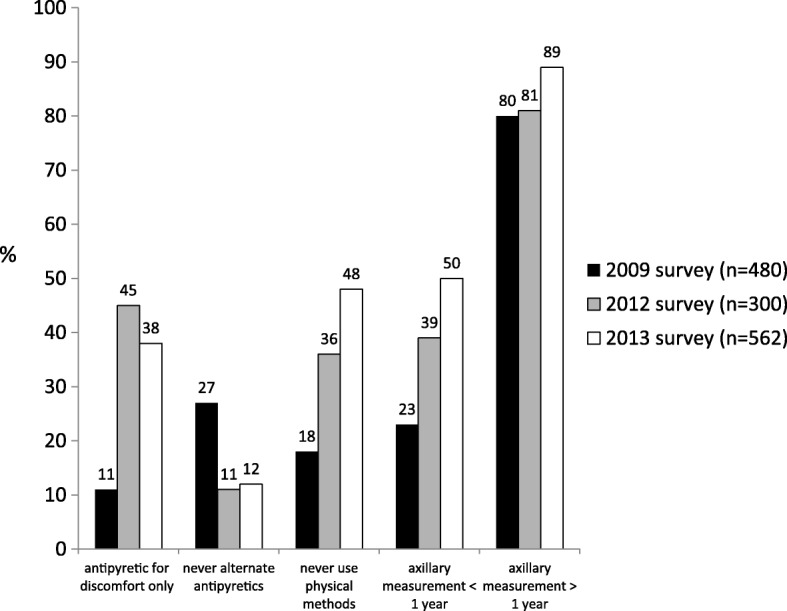 Results: 70.2% (562/800) paediatricians returned the questionnaire. The recommended site and device for body temperature measurement in children > 1 year was correctly chosen by 89.3% of participants (vs. 80.7% of 2012 participants; P < 0.001), but with children aged less than 1 year the correct answer was selected only by the 50.3% (vs. 39.3% of 2012 participants: P < 0.001). Use of physical methods was still incorrectly recommended by 51.6% of paediatricians (vs. 63.6% in 2012; P < 0.001). Use of antipyretics according to discomfort was adopted only by 38.2% of participants, while 12.2% of them recommended alternate use of antipyretics. These proportions were substantially stable since 2012 (45 and 11% respectively), rectal administration of antipyretics only in case of vomiting was correctly recommended by 86.8% of paediatricians vs. 74.7% in 2012 (P < 0.001).