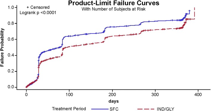 Results: IND/GLY significantly delayed the time to CID (hazard ratio [HR] (95% confidence interval [CI]), 0.72 [0.67-0.78]; P < 0.0001), and reduced the incidences of CID versus SFC. Additionally, IND/GLY delayed the time to CID in all patient subgroups. After 12 weeks until 52 weeks, CID+ patients had a significantly higher rate of moderate-to-severe exacerbations versus CID- patients (P < 0.0001); moreover, CID+ patients experienced moderate-to-severe exacerbations significantly earlier versus CID- patients (P < 0.0001). CID+ patients had a comparable change in the SGRQ total score versus CID- patients.