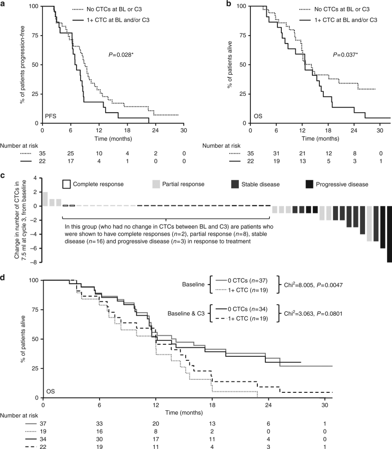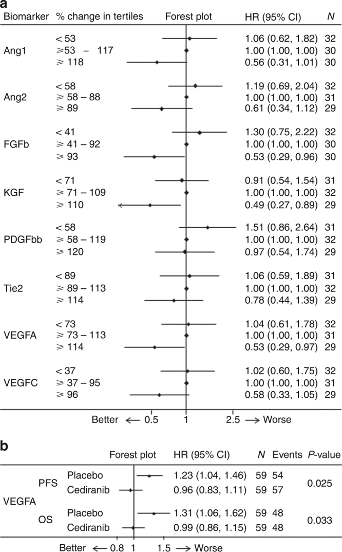 Results: Samples were available from n = 117/124 (94%) patients. Circulating Ang1&2, FGFb, PDGFbb, VEGFC, VEGFR1 and CK18 decreased as a result of the therapy, independent of treatment with cediranib. Circulating VEGFR2 and Tie2 were preferentially reduced by cediranib. Patients with increasing levels of VEGFA at any time had a worse PFS and OS; this detrimental effect was attenuated in patients receiving cediranib. TVC analysis revealed CK18 and VEGFR2 increases correlated with poorer OS in all patients (P < 0.001 and P = 0.02, respectively).