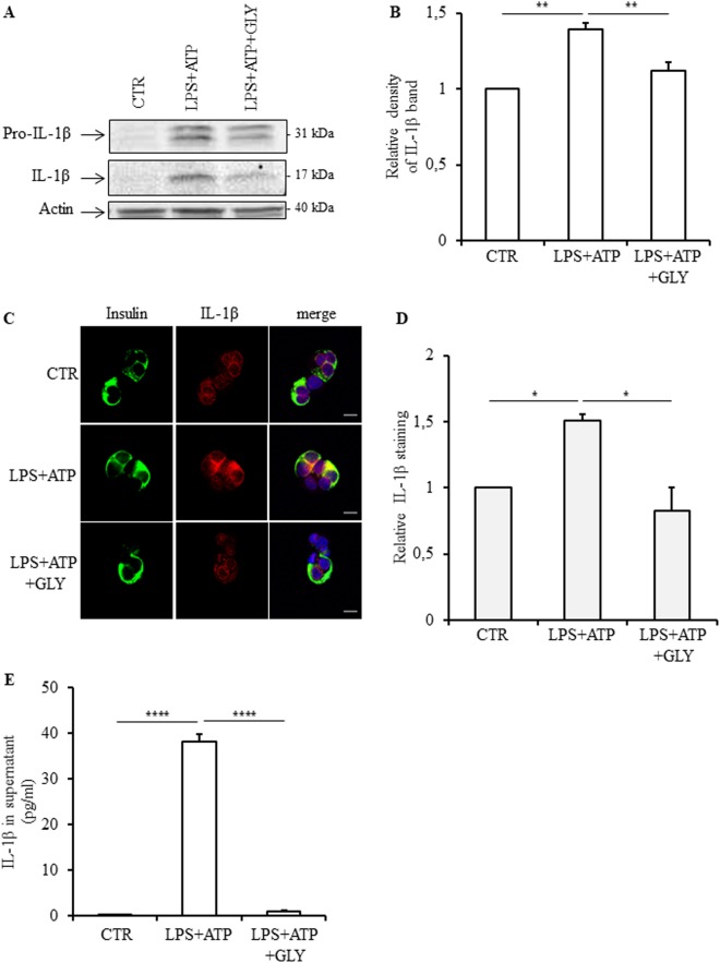 NRLP3 inflammasome is a protein complex involved in the maturation of IL1β. In the onset of type 1 diabetes as well as in islet transplantation, IL-1β is one of the cytokines involved in the recruitment of immune cells in islets and eventually in islet destruction. Whether IL-1β is produced by islet cells is still under debate and NLRP3 inflammasome-dependent IL-1β production has not been yet determined in human islets. The aim of this study was to determine the expression and the regulation of the NRLP3 inflammasome in human islets. Human islets were stimulated with LPS and successively with ATP (LPS + ATP) in the presence or absence of the inflammasome inhibitor glyburide. Islets were also incubated in hypoxic or normoxic conditions for 24 h in the presence or absence of glyburide. Then, IL1B and NLRP3 expression was studied by real time PCR, protein expression by western blot, protein localization by immunofluorescence and protein secretion by ELISA. LPS + ATP increased gene expression of NRLP3 and IL1B. Glyburide partially prevented this effect. IL-1β protein was localized in β and non-β cells. Moreover, LPS + ATP increased IL-1β protein expression and production, which were prevented by glyburide. Hypoxia increased gene expression of NRLP3 and IL1B and induced IL-1β and caspase-1 production. Finally, hypoxia-induced cell death which was not prevented by inhibition of NLRP3 inflammasome. NRLP3 inflammasome is expressed and plays a role in IL-1β production by human islets. By contrast, NRLP3 inflammasome activation is not involved in islet cell death induced by hypoxia.