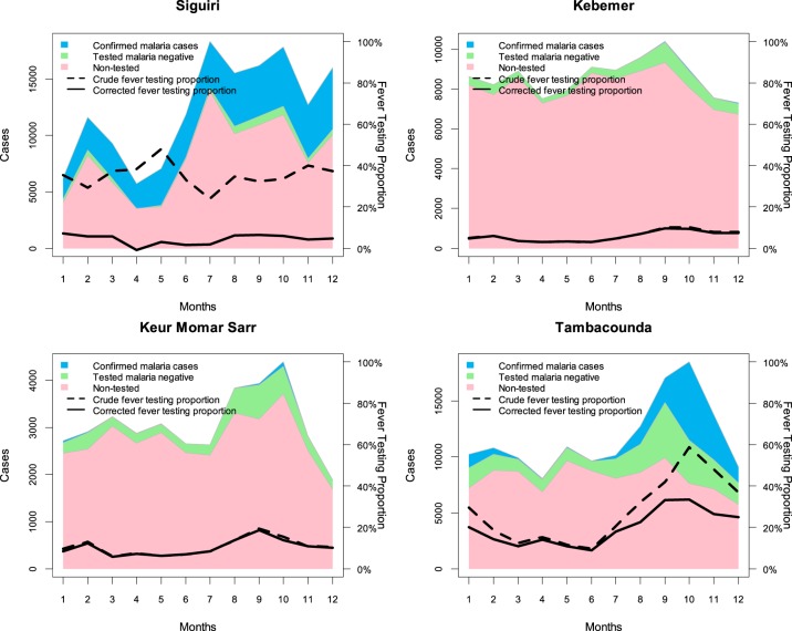 Universal malaria diagnostic testing of all fever cases is the first step in correct malaria case management. However, monitoring adherence to universal testing is complicated by unreliable recording and reporting of the true number of fever cases. We searched the literature to obtain gold-standard estimates for the proportion of patients attending outpatient clinics in sub-Saharan Africa with malarial and non-malarial febrile illness. To correct for differences in malaria transmission, we calculated the proportion of patients with fever after excluding confirmed malaria cases. Next, we analyzed routine data from Guinea and Senegal to calculate the proportion of outpatients tested after exclusion of confirmed malaria cases from the numerator and denominator. From 12 health facility surveys in sub-Saharan Africa with gold-standard fever screening, the median proportion of febrile illness among outpatients after exclusion of confirmed malaria fevers was 57% (range: 46-80%). Analysis of routine data after exclusion of confirmed malaria cases demonstrated much lower testing proportions of 23% (Guinea) and 13% (Senegal). There was substantial spatial and temporal heterogeneity in this testing proportion, and testing in Senegal was correlated with malaria season. Given the evidence from gold-standard surveys that at least 50% of non-malaria consultations in sub-Saharan Africa are for febrile illness, it appears that a substantial proportion of patients with fever are not tested for malaria in health facilities when considering routine data. Tracking the proportion of patients tested for malaria after exclusion of the confirmed malaria cases could allow programs to make inferences about malaria testing practices using routine data.