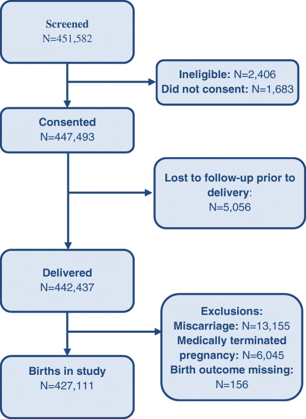 Results: The mean stillbirth rates for the sites were 21.3 per 1000 births for Africa, 25.3 per 1000 births for India, 56.9 per 1000 births for Pakistan and 19.9 per 1000 births for Guatemala. From 2010 to 2016, across all sites, the mean stillbirth rate declined from 31.7 per 1000 births to 26.4 per 1000 births for an average annual decline of 3.0%. Risk factors for stillbirth were similar across the sites and included maternal age < 20 years and age > 35 years. Compared to parity 1-2, zero parity and parity > 3 were both associated with increased stillbirth risk and compared to women with any prenatal care, women with no prenatal care had significantly increased risk of stillbirth in all sites.