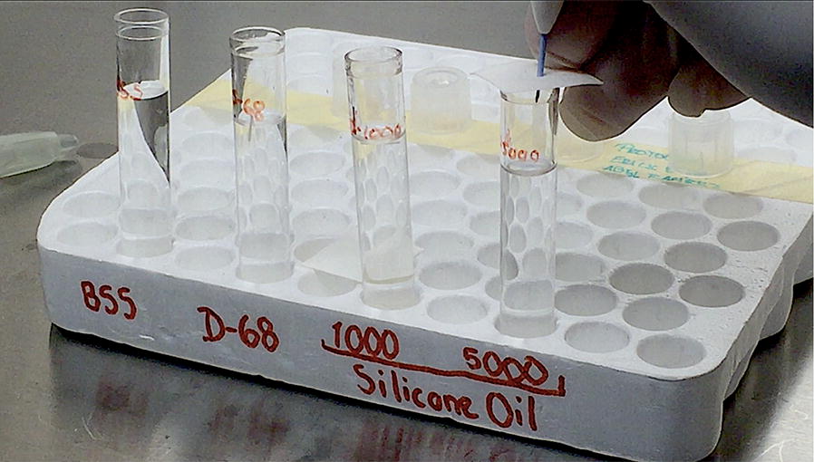 Methods: Basic, experimental, prospective and transversal study performed at the hospital "Nuestra Señora de la Luz" in Mexico City. One dexamethasone implant was placed in a test tube with 4 mL of each tamponade medium: 1000cS, 5000cS and heavy silicone oil; basic saline solution was used as the control medium. Photographs were taken weekly for 12 months. 200 µL samples were taken from each medium at 24 h, 1, 2 weeks and monthly for 12 months. ELISA test was performed to quantify dexamethasone release in every sample. An inflammatory stimulus was created and later exposed it to every sample in order to test their anti-inflammatory capacity by cytokine analysis using cytometric bead array. Statistically significant results were obtained with p < 0.05.