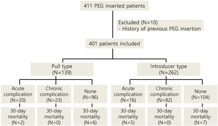 Methods: In total, 401 patients who underwent first PEG insertion at the Asan Medical Center, Seoul, Korea, between January 2005 and December 2015 were eligible. Medical records were retrospectively reviewed to determine clinical characteristics and outcomes of 139 and 262 patients who underwent pull-type and introducer-type PEG, respectively.