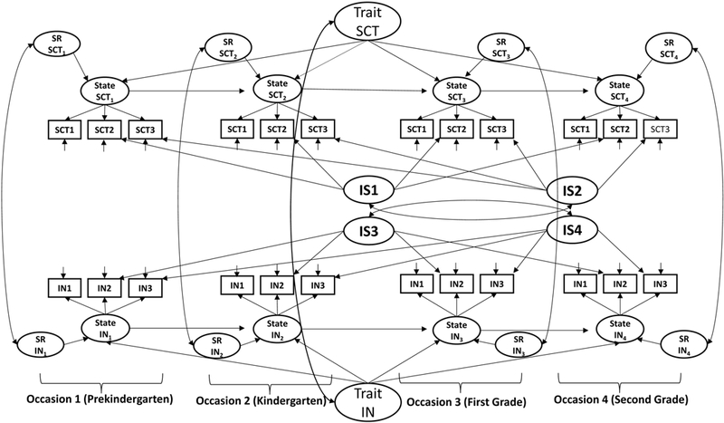 Results: Both SCT and ADHD-IN contained more trait variance (Ms = 65% and 61%, respectively) than occasion-specific variance (Ms = 35% and 39%) in early childhood, with trait variance increasing as children progressed from preschool through early elementary school. In regression analyses: (a) SCT significantly predicted greater withdrawal and anxiety/depression whereas ADHD-IN did not uniquely predict these internalizing domains; (b) ADHD-IN uniquely predicted more externalizing behaviors whereas SCT uniquely predicted fewer externalizing behaviors; (c) SCT uniquely predicted shyness whereas both SCT and ADHD-IN uniquely predicted global social difficulties; and (d) ADHD-IN uniquely predicted poorer math achievement and slower processing speed whereas SCT more consistently predicted poorer reading achievement.