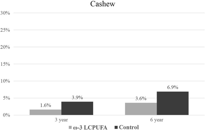 Results: Changes over time in symptoms of allergic disease with sensitization (IgE-mediated) and sensitization did not differ between the groups; interaction p = 0.49, p = 0.10, respectively. Averaged across the 1, 3 and 6-year assessments, there were no significant effects of prenatal ω-3 LCPUFA supplementation on IgE-mediated allergic disease symptoms (adjusted relative risk 0.88 (95% CI 0.69, 1.12), p = 0.29) or sensitization (adjusted relative risk 0.97 (95% CI 0.82, 1.15), p = 0.76). Sensitization patterns to common allergens were consistent with the atopic march, with egg sensitization at 1 year strongly associated with house dust mite sensitization at 6 years, (p < 0.0001).