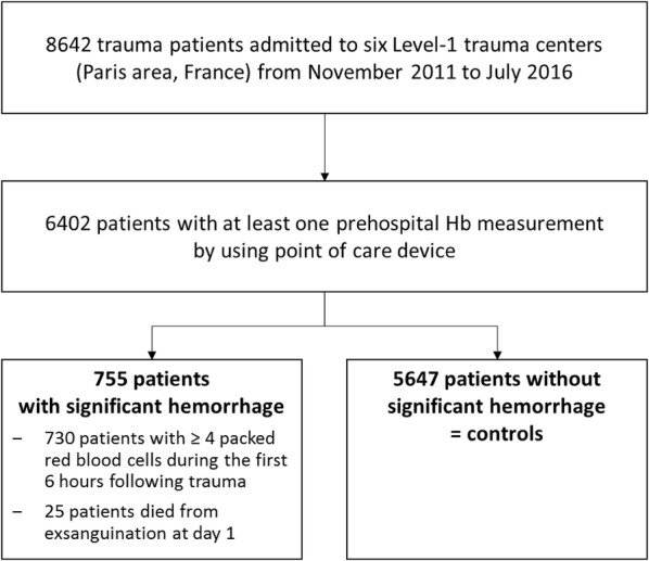 Methods: All consecutive adult trauma patients directly admitted to six French level-1 trauma centers with at least one prehospital Hb measurement were analyzed. The abilities of the following variables to identify SH (≥ 4 units of red blood cells in the first 6 h and/or death related to uncontrolled bleeding within 24 h) were determined and compared to that of shock index (SI): Hb as measured with a point-of-care (POC) device by the prehospital team on scene (POC-Hbprehosp) and upon patient's admission to the hospital (POC-Hbhosp), the difference between POC-Hbhosp and POC-Hbprehosp (DeltaPOC-Hb) and Hb as measured by the hospital laboratory on admission (Hb-Labhosp).