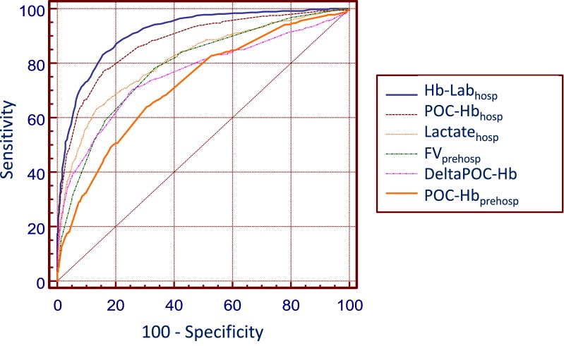 Conclusions: Challenging the classical idea that early Hb measurement is not meaningful in predicting SH, POC-Hbprehosp was able, albeit modestly, to predict significant hemorrhage. POC-Hbhosp had a greater ability to predict SH when compared to shock index. For a given prehospital fluid volume infused, the magnitude of the Hb drop was significantly higher in patients with significant hemorrhage than in controls.