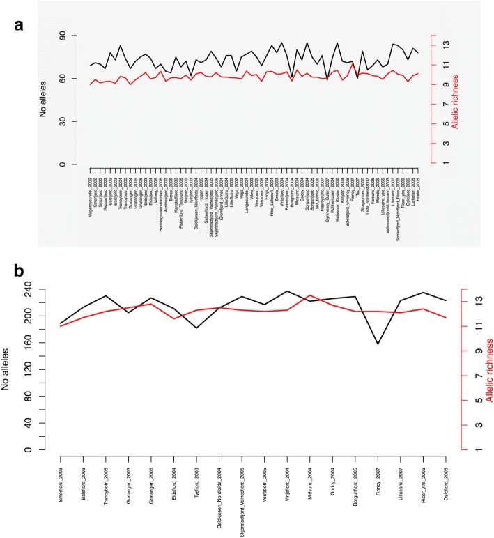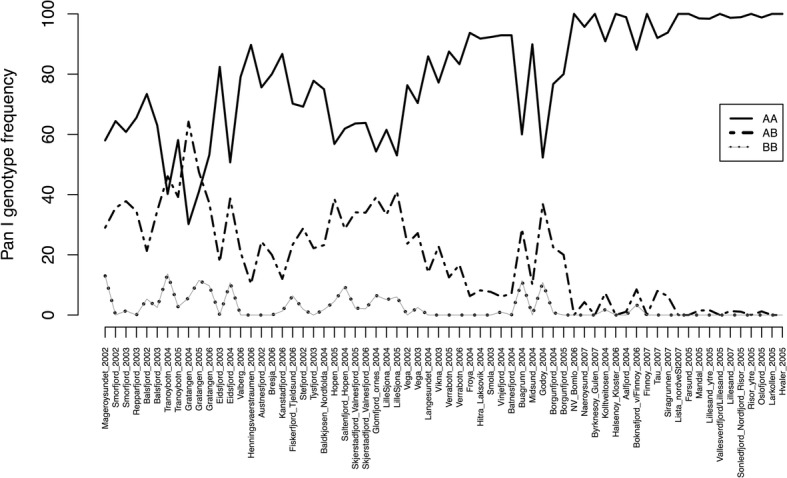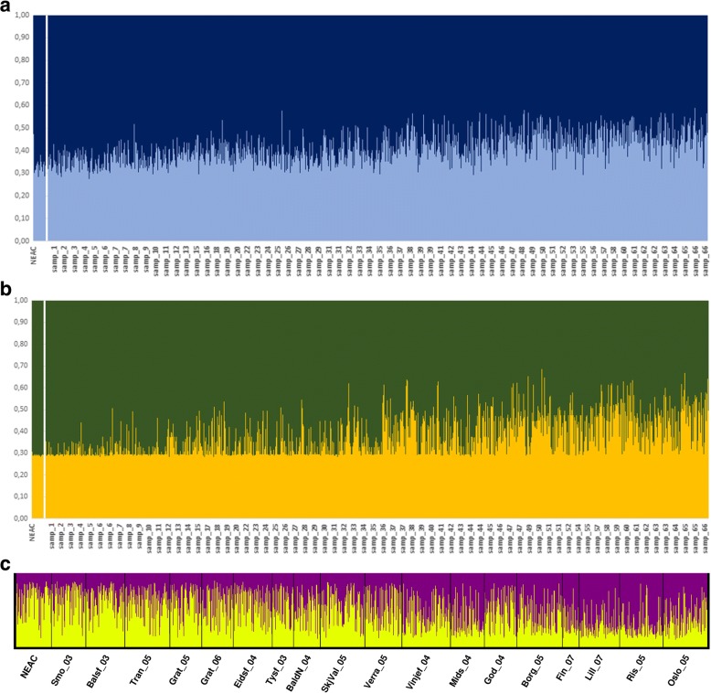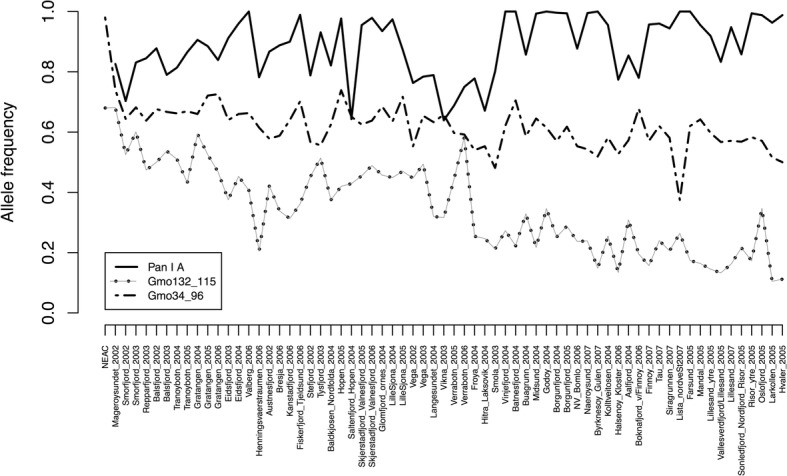 Results: We found no difference in genetic diversity, measured as number of alleles, allelic richness, heterozygosity nor effective population sizes, in the north-south gradient. In both data sets, weak but significant population genetic structure was revealed (Dataset 1: global FST = 0.008, P < 0.0001. Dataset 2: global FST = 0.004, P < 0.0001). While no clear genetic groups were identified, genetic differentiation increased among geographically-distinct samples. Although the locus Gmo132 was identified as a candidate for positive selection, possibly through linkage with a genomic region under selection, overall trends remained when this locus was excluded from the analyses. The most common allele in loci Gmo132 and Gmo34 showed a marked frequency change in the north-south gradient, increasing towards the frequency observed in NEAC in the north.