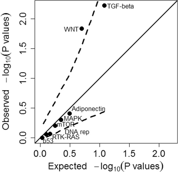 Results: The TGF-β and WNT pathways were associated with all CRC, and the WNT pathway was associated with colon cancer. Individual genes demonstrating the strongest associations were TGFBR2 in the TGF-β pathway and SMAD7 (which is involved in both the TGF-β and WNT pathways). As partial validation of our approach, a known CRC risk variant in SMAD7 (in both the TGF-β and WNT pathways: rs11874392) was associated with CRC risk in our data. We also detected two novel candidate CRC risk variants (rs13075948 and rs17025857) in TGFBR2, a gene known to be associated with CRC risk.