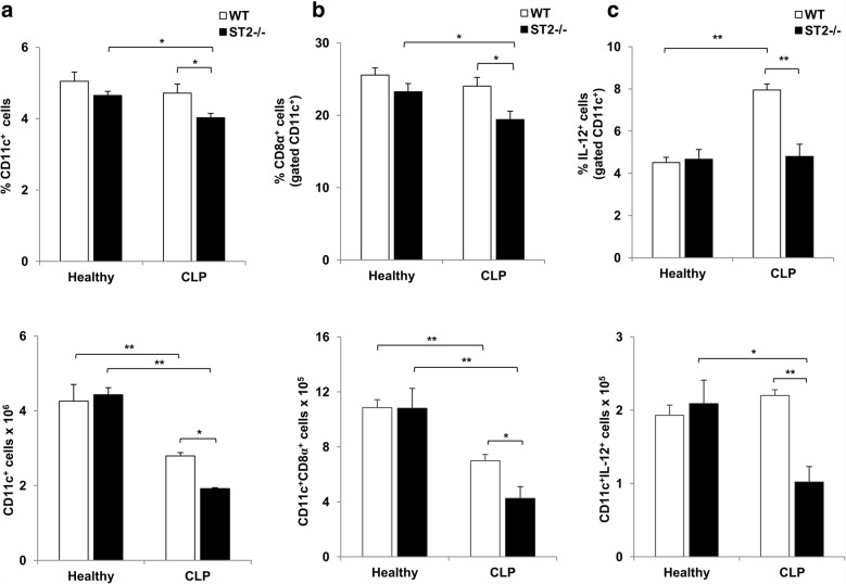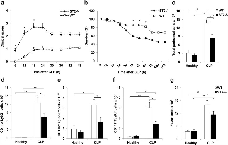 Results: Deletion of ST2 leads to increased susceptibility to early manifestations of sepsis as evaluated by clinical signs and survival. These are accompanied by decrease in the total number of neutrophils, eosinophils and mast cells in peritoneal cavity 12 h after CLP. In early sepsis there was also low number of precursors of myeloid cells in particular CD11b+Ly6G+Ly6Clow cells in spleen of ST2-/- mice. Although the number of NK cells in the spleen was similar, there were significant differences in the presence of inflammatory IFN-γ and IL-17 producing NK cells. Further, ST2 deletion affects the phenotype and maturation of dendritic cell in sepsis. The total number of dendritic cells in the spleen was lower as well as IL-12 expressing dendritic cells. Finally, there was higher frequency of active caspase-3 positive and early apoptotic cells, in particular CD11c positive cells, in spleen of septic ST2-/- mice.