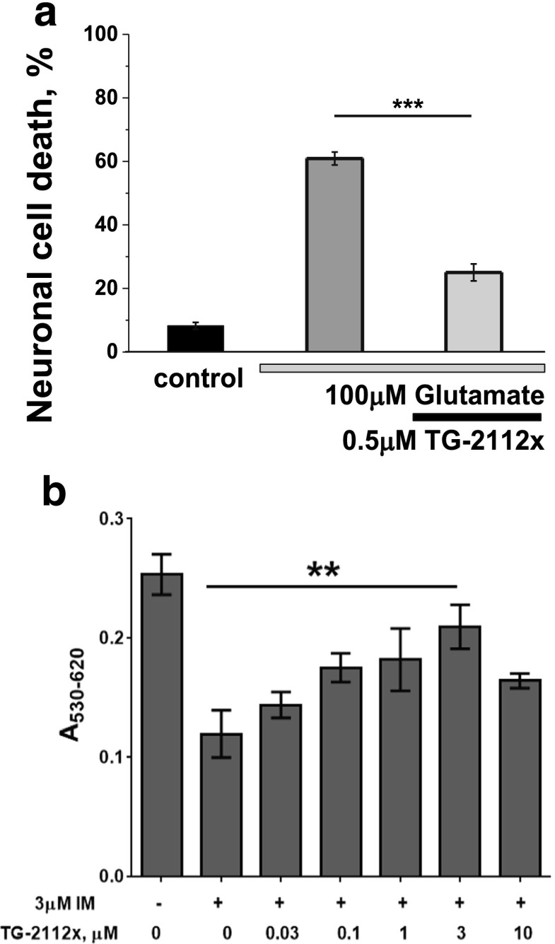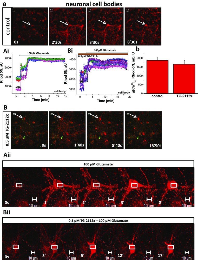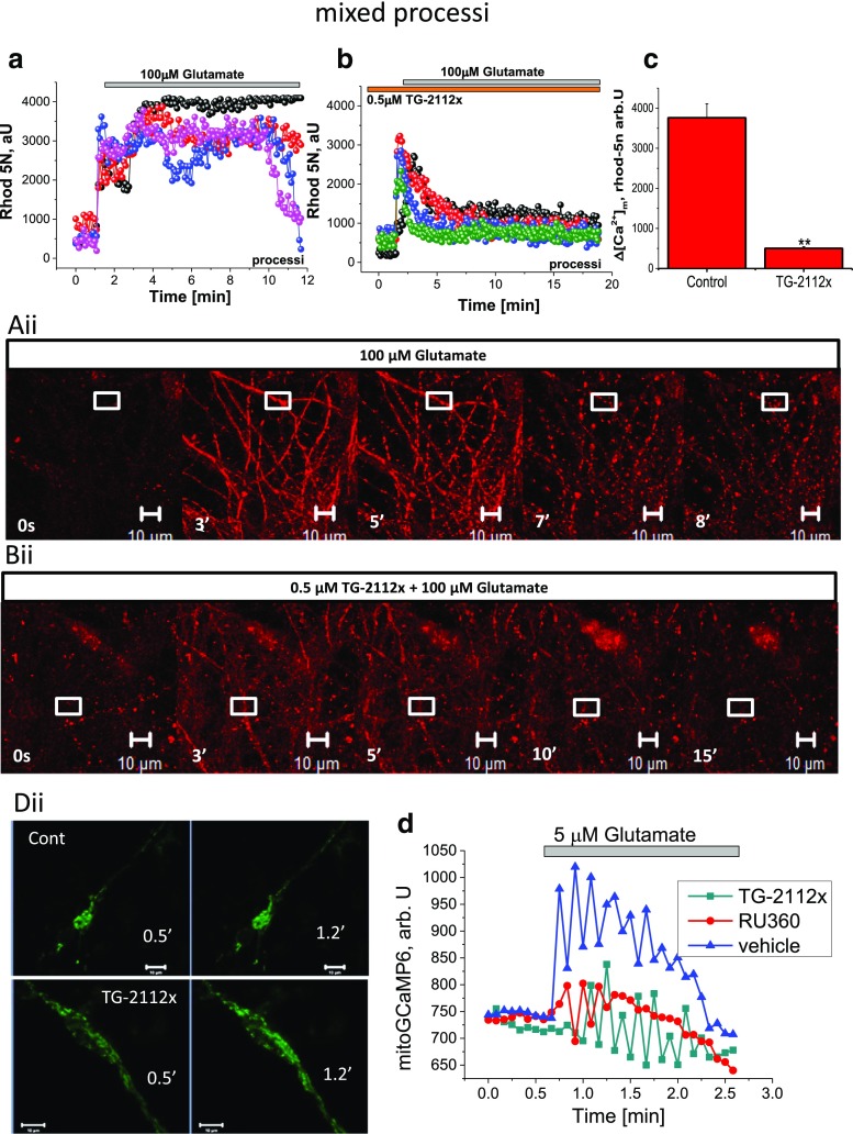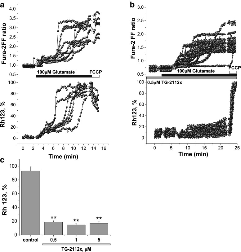 Neuronal excitotoxicity which is induced by exposure to excessive extracellular glutamate is shown to be involved in neuronal cell death in acute brain injury and a number of neurological diseases. High concentration of glutamate induces calcium deregulation which results in mitochondrial calcium overload and mitochondrial depolarization that triggers the mechanism of cell death. Inhibition of mitochondrial calcium uptake could be potentially neuroprotective but complete inhibition of mitochondrial calcium uniporter could result in the loss of some physiological processes linked to Ca2+ in mitochondria. Here, we found that a novel compound, TG-2112x, can inhibit only the lower concentrations mitochondrial calcium uptake (induced by 100 nM-5 μM) but not the uptake induced by higher concentrations of calcium (10 μM and higher). This effect was not associated with changes in mitochondrial membrane potential and cellular respiration. However, a pre-treatment of neurons with TG-2112x protected the neurons against calcium overload upon application of toxic concentrations of glutamate. Thus, sequestration of mitochondrial calcium uptake protected the neurons against glutamate-induced mitochondrial depolarization and cell death. In our hands, TG-2112x was also protective against ionomycin-induced cell death. Hence, low rate mitochondrial calcium uptake plays an underestimated role in mitochondrial function, and its inhibition could protect neurons against calcium overload and cell death in glutamate excitotoxicity.
