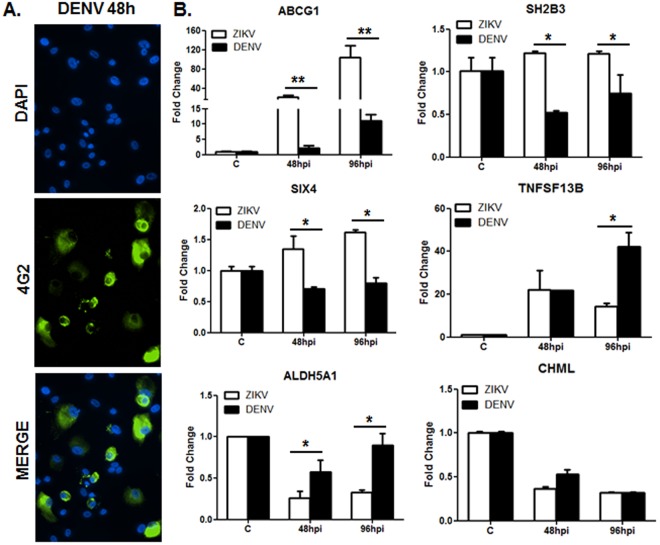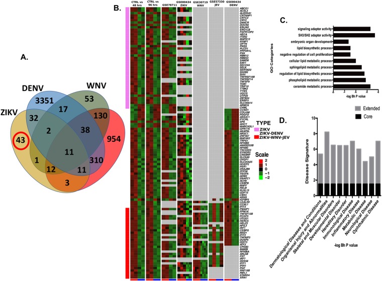 Previously, we reported that Zika virus (ZIKV) causes ocular complications such as chorioretinal atrophy, by infecting cells lining the blood-retinal barrier, including the retinal pigment epithelium (RPE). To understand the molecular basis of ZIKV-induced retinal pathology, we performed a meta-analysis of transcriptome profiles of ZIKV-infected human primary RPE and other cell types infected with either ZIKV or other related flaviviruses (Japanese encephalitis, West Nile, and Dengue). This led to identification of a unique ZIKV infection signature comprising 43 genes (35 upregulated and 8 downregulated). The major biological processes perturbed include SH3/SH2 adaptor activity, lipid and ceramide metabolism, and embryonic organ development. Further, a comparative analysis of some differentially regulated genes (ABCG1, SH2B3, SIX4, and TNFSF13B) revealed that ZIKV induced their expression relatively more than dengue virus did in RPE. Importantly, the pharmacological inhibition of ABCG1, a membrane transporter of cholesterol, resulted in reduced ZIKV infectivity. Interestingly, the ZIKV infection signature revealed the downregulation of ALDH5A1 and CHML, genes implicated in neurological (cognitive impairment, expressive language deficit, and mild ataxia) and ophthalmic (choroideremia) disorders, respectively. Collectively, our study revealed that ZIKV induces differential gene expression in RPE cells, and the identified genes/pathways (e.g., ABCG1) could potentially contribute to ZIKV-associated ocular pathologies.