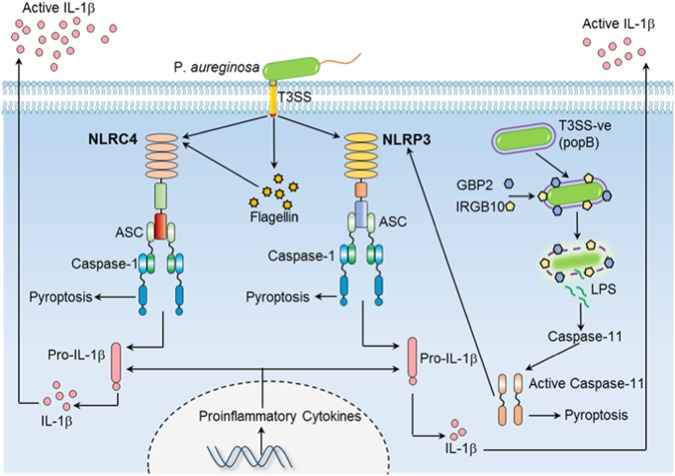 Detection of bacterial ligands is a pre-requisite for inflammasome activation. During Pseudomonas aeruginosa infection, flagellin which is secreted through the T3SS is detected by the NLRC4 inflammasome. Activation of the NLRC4 inflammasome is believed to contribute to high IL-1β production and pathogenicity in cystic fibrosis patients with chronic P. aeruginosa infection. Interestingly, the majority of P. aeruginosa isolated from cystic fibrosis patients with chronic airway infection are non-motile and T3SS-negative, suggesting that yet un-characterized inflammasome pathways regulate IL-1β production in cystic fibrosis patients. Here we demonstrate the role of guanylate-binding proteins (GBPs) in regulating bacterial proliferation and inflammasome activation in response to T3SS-negative P. aeruginosa. Bacterial ligands liberated by the action of GBP2 and IRGB10 activate caspase-11 and regulate non-canonical NLRP3 inflammasome activation and IL-1β release. Overall, our results reveal the role of caspase-11 in inhibiting bacterial proliferation and promoting IL-1β secretion during T3SS-negative P. aeruginosa infection. This study suggests that non canonical inflammasomes might have co-evolved to detect Gram-negative bacterial pathogens that have evolved to bypass detection by canonical NLRs.